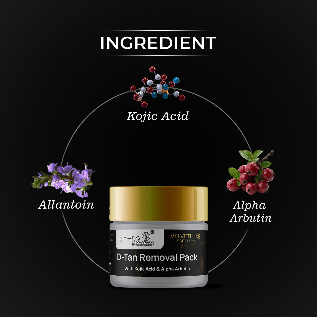 Velvetluxe D-Tan Removal Cream is a salon-grade formula designed to remove stubborn tan and dull buildup. Enriched with Kojic Acid, Niacinamide, and Aloe Vera, it helps lighten dark patches, refresh skin, and restore natural brightness.