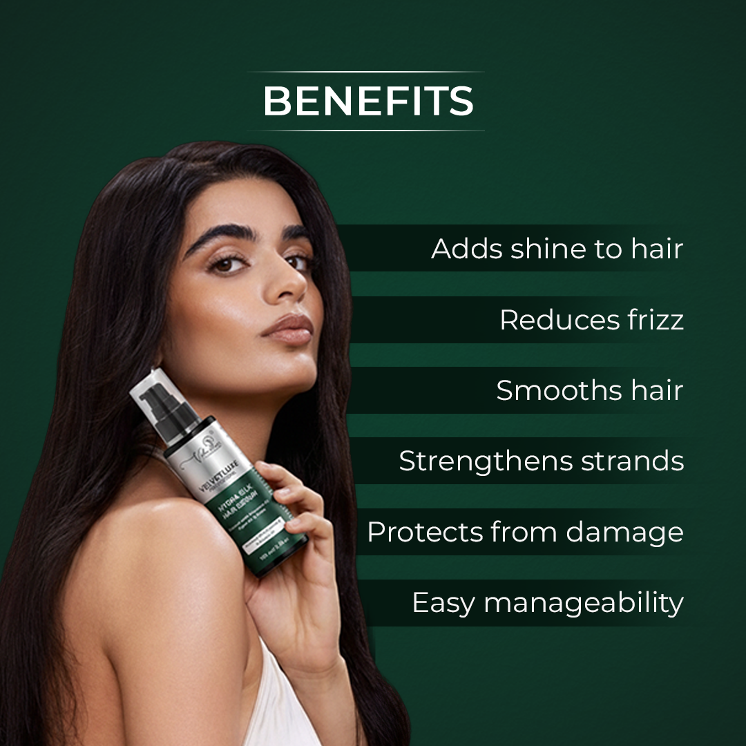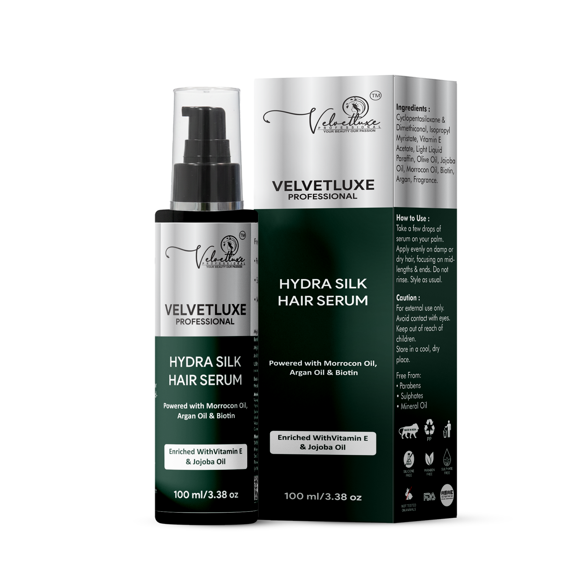 Velvetluxe HydraSilk Hair Serum is a professional-grade smoothing serum designed to control frizz and enhance shine. Infused with Argan Oil, Vitamin E, and Keratin, it nourishes hair strands, repairs split ends, and leaves hair soft, silky, and manageable without weighing it down.