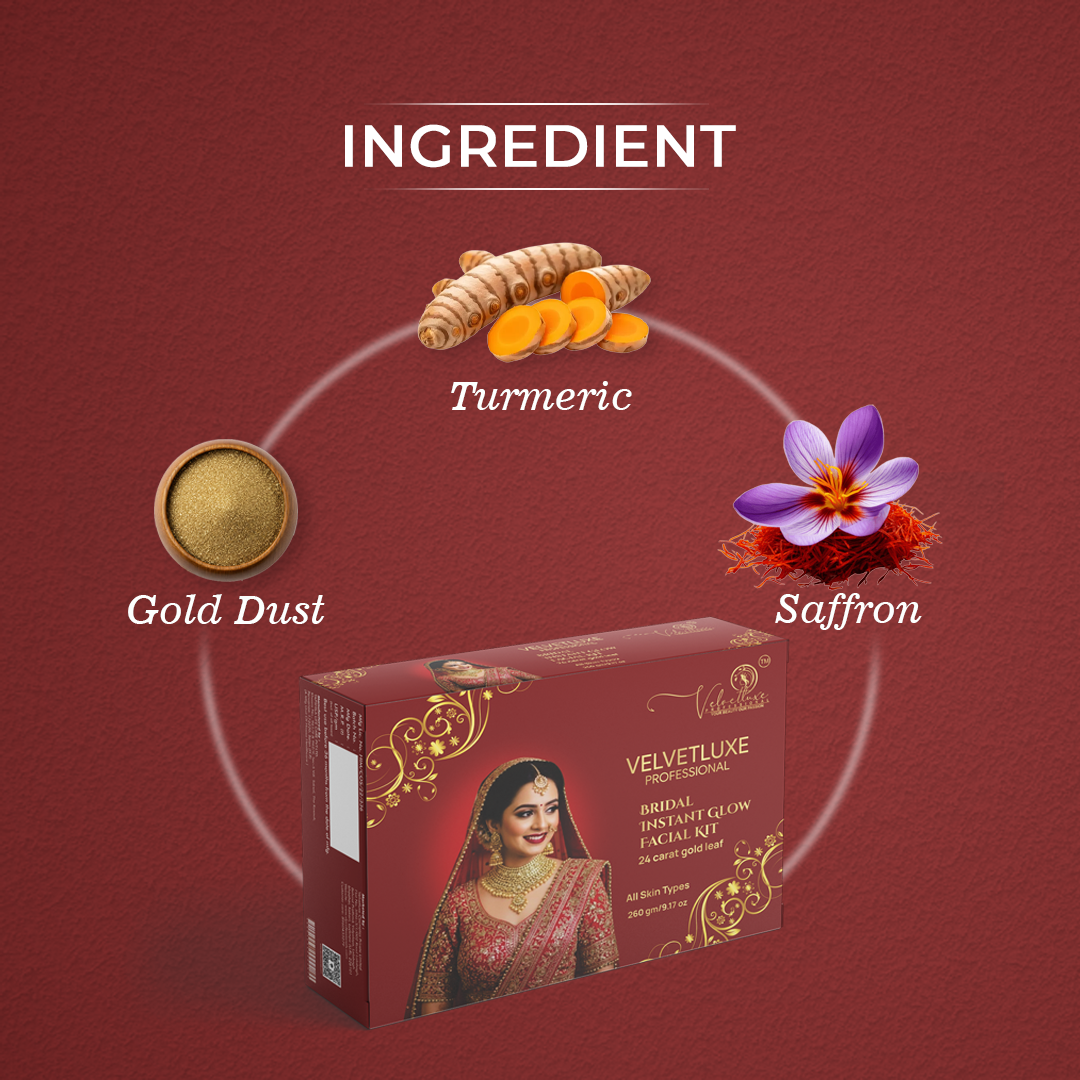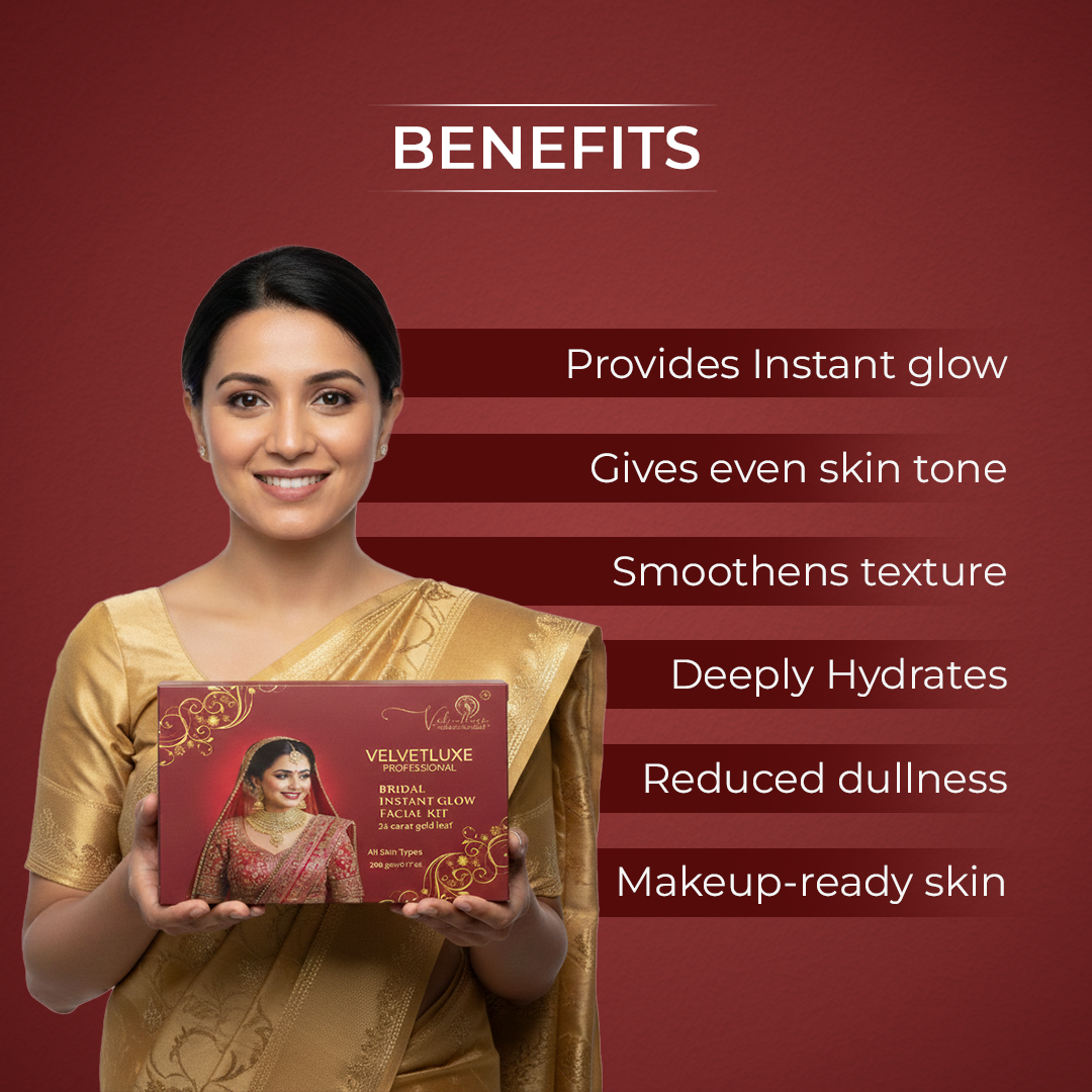Velvetluxe Bridal Instant Glow Facial Kit is a salon-grade facial solution crafted for special occasions. Powered with Pearl Extracts, Vitamin C, Aloe Vera, and botanical actives, it deeply nourishes skin, smoothens texture, and delivers instant, visible glow.
